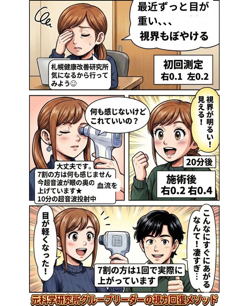 2022年に独立のため退職し札幌へ帰郷。2023年に 札幌健康改善研究所 を立ち上げ、超音波×眼筋アプローチによる手術に頼らない視力回復サポートを開始しています。