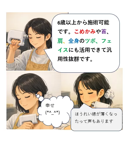 ※ 次の場合は施術を行えません:目に炎症・怪我・感染症(ものもらい、結膜炎)がある方、白内障や網膜剥離の術後3か月以内の方。